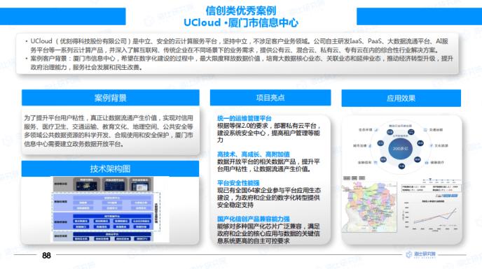 厦门市大数据安全开放平台是UCloudStack私有云平台在政务领域良好运用的实践,项目整体采用全国产架构,在近百台承载鲲鹏CPU和Atlas AI加速卡的华为泰山服务器上部署了UCloudStack私有云信创产品以及UCloud优刻得安全屋产品,成功推动云计算、大数据、人工智能等新技术与厦门实体经济深度融合,推动数字建设应用迈向“智慧化”新阶段。