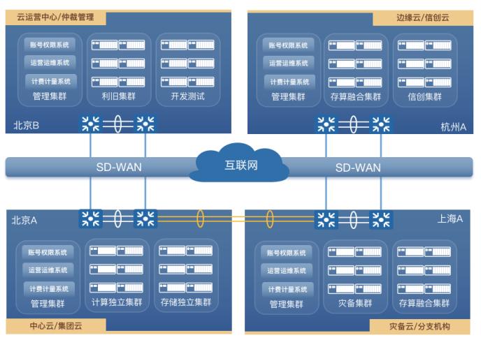 该方案通过平台完备的适配能力提供一云多芯的异构资源管理,建设信创资源池的同时利旧和纳管传统架构资产,方便不同业务可以按需选用合适的资源类型。通过多地域统一管理能力实现多数据中心、多集群的统一管理,提供统一运维和运营的一致体验。