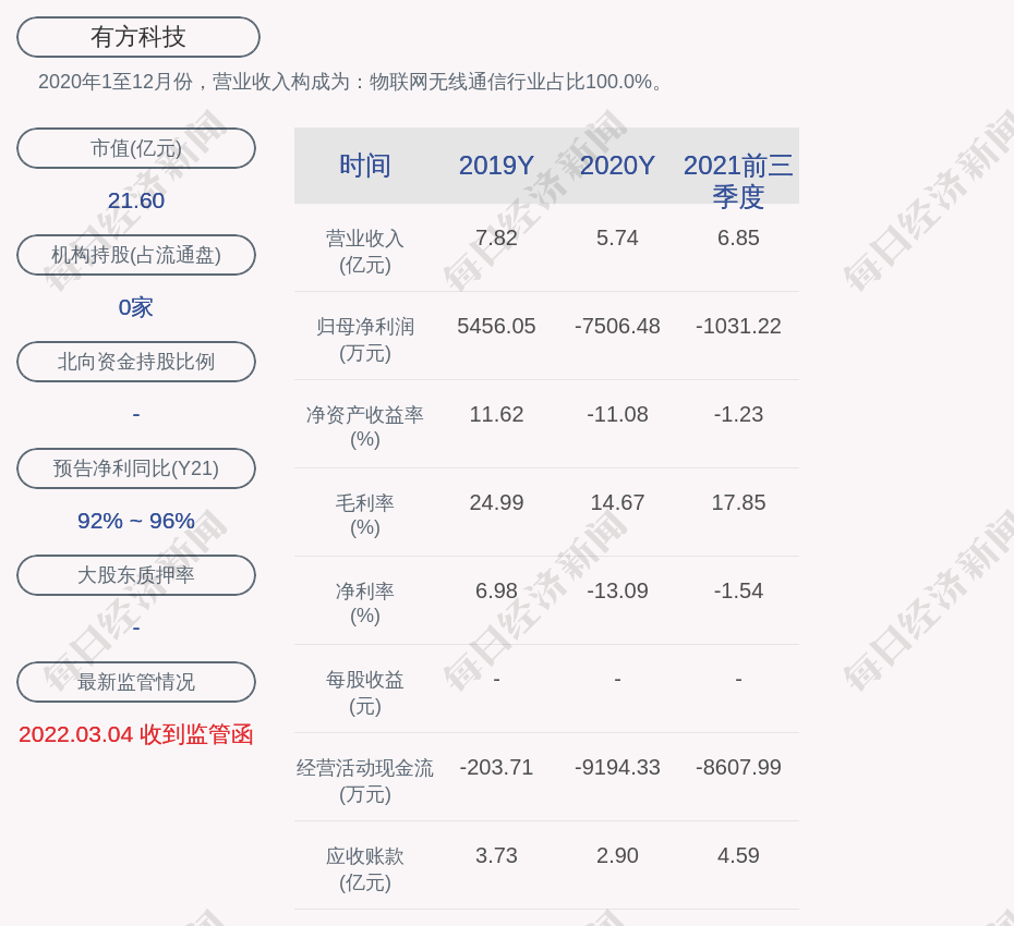 2020年1至12月份,有方科技的营业收入构成为:物联网无线通信行业占比100.0%。