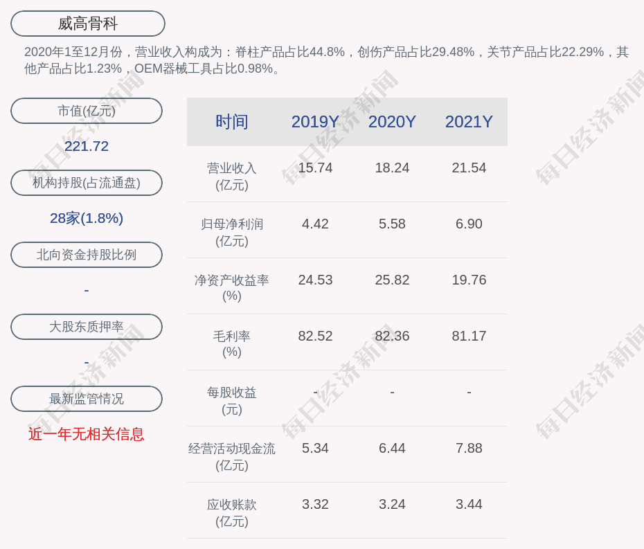 威高骨科(SH 688161,收盘价:55.43元)3月29日晚间发布年度业绩报告称,2021年营业收入约21.54亿元,同比增加18.08%;归属于上市公司股东的净利润盈利约6.9亿元,同比增加23.62%;基本每股收益盈利1.82元,同比增加16.67%。不送红股、不转增。