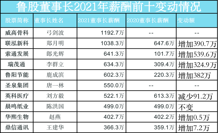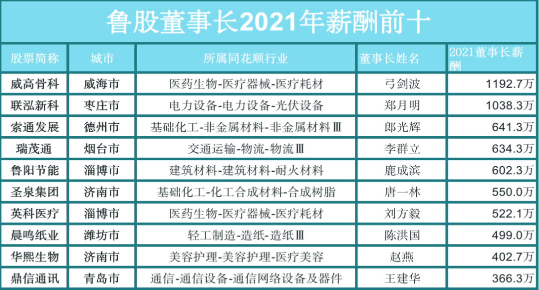 记者注意到,威高骨科于去年6月30登陆上交所科创板,董事长弓剑波首次登上榜单便拿到最高薪酬,令人咋舌。而在2020年底上市的联泓新科,董事长薪酬也“不甘示弱”。2021年,董事长郑月明从上市公司取得的税前报酬为1038.34万元,较2020年的647.58万元增加了60%。此外,去年8月份上市的圣泉集团,也跻身董事长薪酬前十,公司董事长唐一林2021年取得的薪酬为550万元,在鲁股中排名第六。可见,新上市的企业往往出手阔绰。