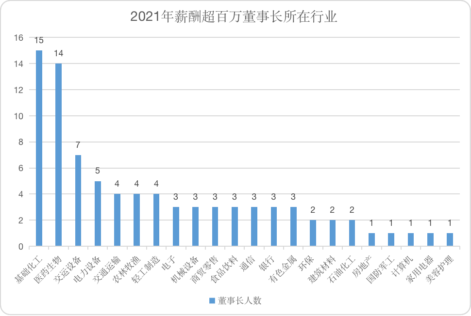 此外,交通运输、农林牧渔和轻工制造行业均有4位董事长2021年薪酬超过百万,银行、电子、食品饮料等7个行业分别有3位董事长2021年薪酬超过百万,环保、建筑材料、石油化工3个行业分别有2位董事长2021年薪酬超过百万,房地产、美容护理等5个行业则分别有1位董事长2021年薪酬超过百万。