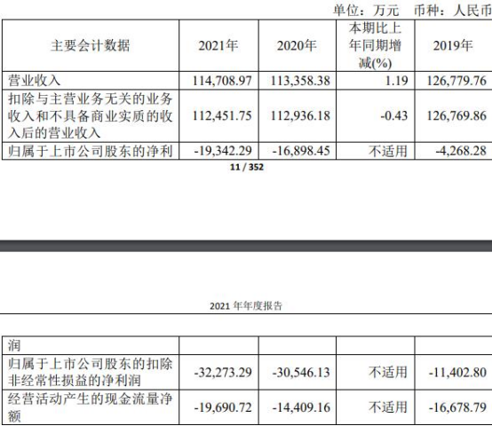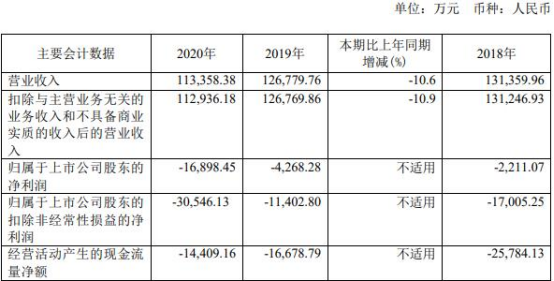 2020年,公司实现营业收入11.34亿元,同比减少10.6%;归属于上市公司股东的净利润-1.69亿元;归属于上市公司股东的扣除非经常性损益的净利润-3.05亿元;经营活动产生的现金流量净额为-1.44亿元。