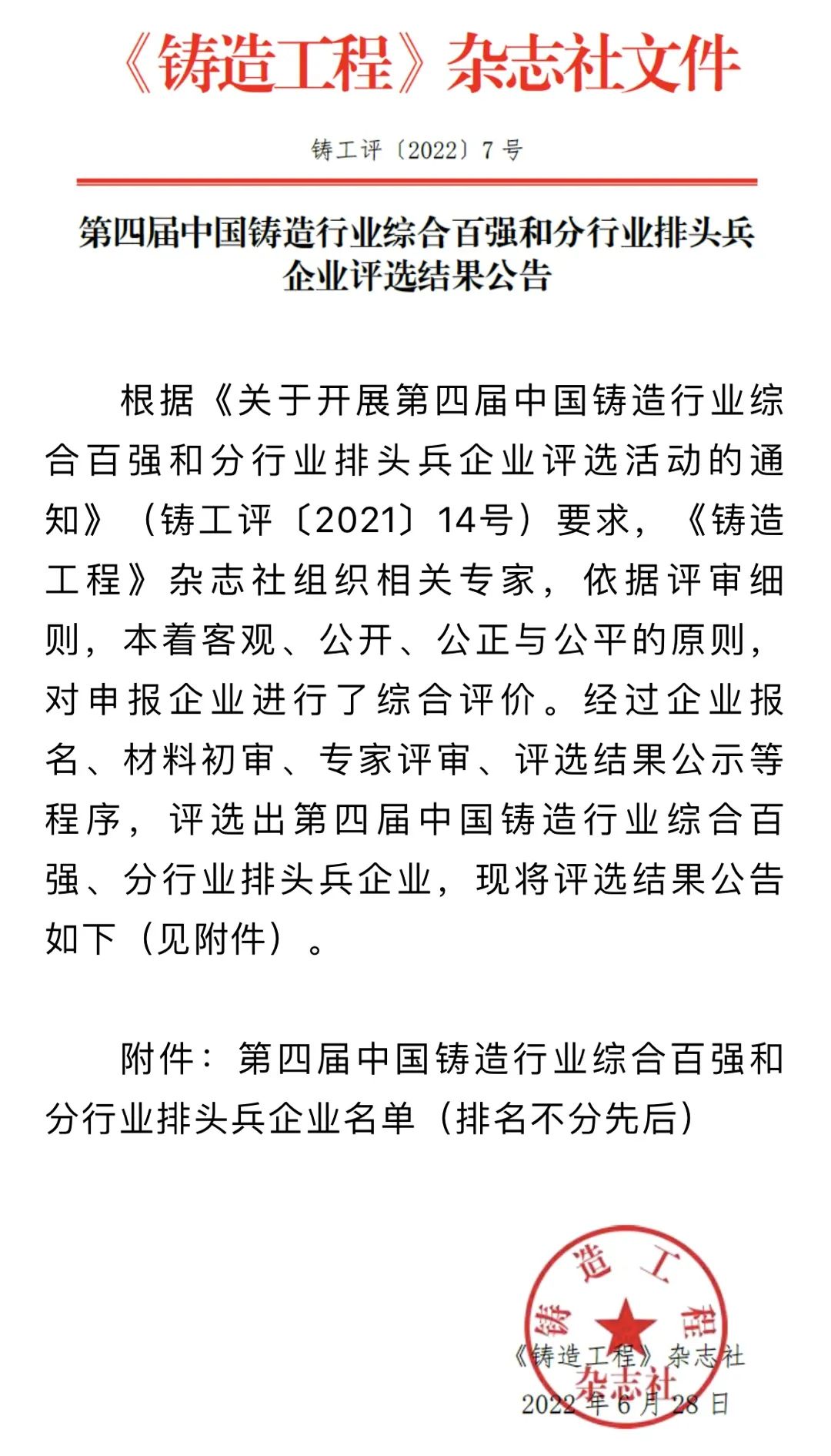 近日,《铸造工程》杂志社发布了“第四届中国铸造行业综合百强名单”。据悉,该奖项为每四年一次的企业评选,旨在企业展示行业形象,树立行业标杆,客观、真实地反映中国铸造企业近些年来的发展成就。