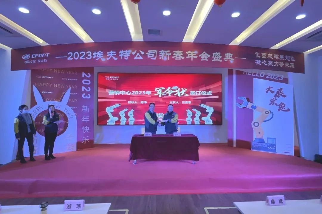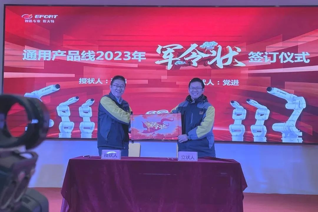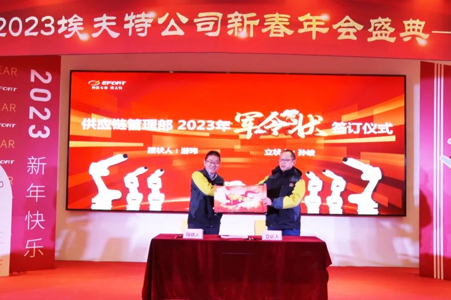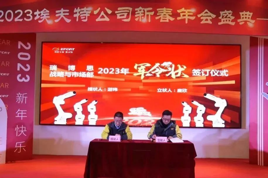 1月30日上午,埃夫特公司各业务板块、职能组织负责人斗志满怀,与公司董事长兼总经理游玮博士,分别签署了2023年目标“军令状”,这是一份压力与动力并存的双向承诺,也是一份不破楼兰终不还的决心;2023年,埃夫特人凝心聚力;2023年,埃夫特人破茧成蝶。