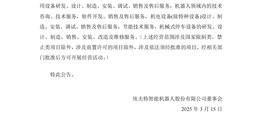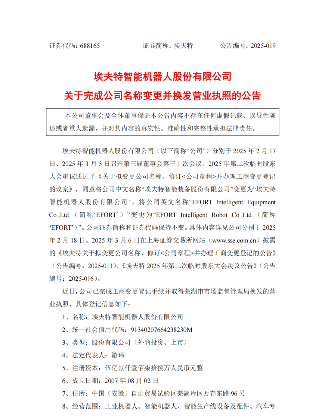 埃夫特智能机器人股份有限公司(以下简称“公司”)分别于2025年2月17日、2025年3月5日召开第三届董事会第三十次会议、2025年第二次临时股东大会审议通过了《关于拟变更公司名称、修订公司章程并办理工商变更登记的议案》,同意将公司中文名称“埃夫特智能装备股份有限公司”变更为“埃夫特智能机器人股份有限公司”,将公司英文名称“EFORT Intelligent EquipmentCo.,Ltd.(简称‘EFORT’)”变更为“EFORT Intelligent Robot Co.,Ltd.(简称‘EFORT’)”。公司证券简称和证券代码保持不变。具体内容详见公司分别于2025年2月18日、2025年3月6日在上海证券交易所网站(www.sse.com.cn)披露的《埃夫特关于拟变更公司名称、修订公司章程并办理工商变更登记的公告》(公告编号:2025-011)、《埃夫特2025年第二次临时股东大会决议公告》(公告编号:2025-016)。
