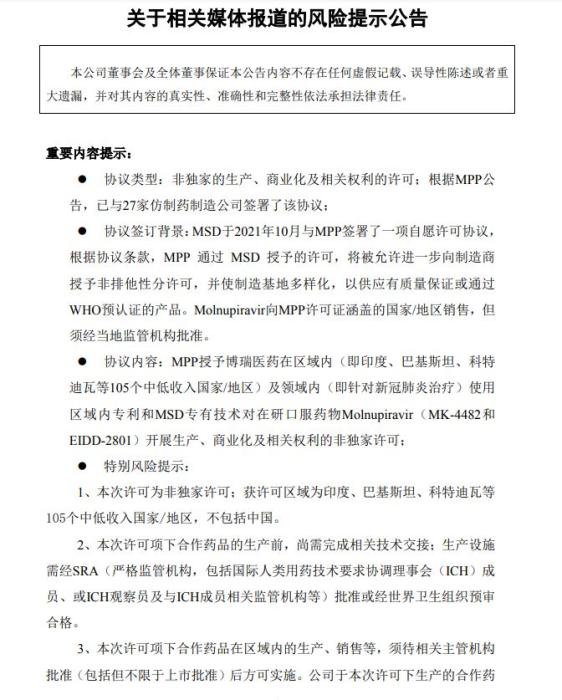 此外,博瑞医药于本次许可下生产的合作药品在区域内能否获得当地药品监管机构上市批准、于区域内的上市时间,上市后的销售情况,以及Molnupiravir的临床结果均存在不确定性。