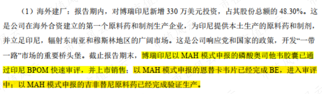 博瑞印尼是博瑞医药参股48.30%的项目(不并表),是在印尼建设的原料药和制剂工厂,项目一期规划原料药产能约3,677kg,涉及产品包括恩替卡韦、磷酸奥司他韦、吉非替尼和西格列汀等原料药。目前一期接近完工,奥司他韦胶囊已开始上市销售。
