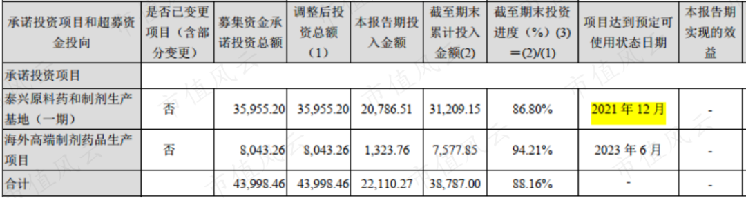 具体来看,泰兴原料药和制剂生产基地(一期)是博瑞医药上市时唯一募投项目,拟投入募集资金3.60亿元,2021年12月才达到预定可使用状态。