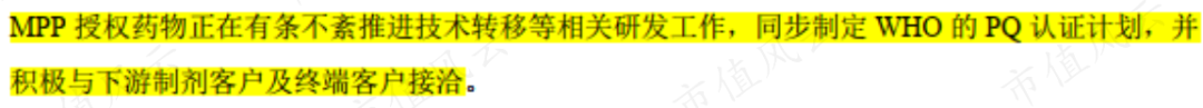根据2021年报,MPP授权药物正在推进技术转移等相关研发工作,同步制定WHO的PQ认证计划,并与下游制剂客户及终端客户接洽。
