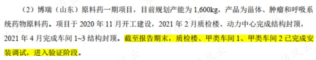 博瑞(山东)原料药一期项目,计划投资3亿元,规划产能为1,600kg,产品为甾体、肿瘤和呼吸系统药物原料药,原计划2022年10月建成。目前累计投资2.03亿,已完成安装调试。
