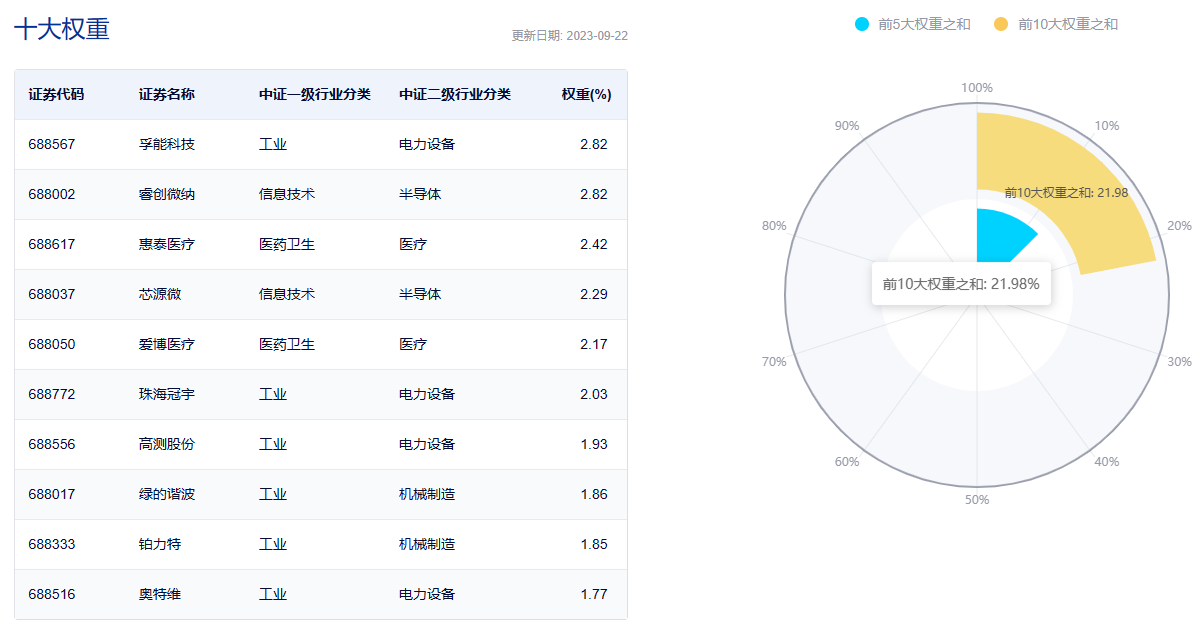 数据显示,截至2023年9月22日,该指数前十大权重股包括孚能科技、睿创微纳、惠泰医疗、芯源微、爱博医疗等,前十大之和为21.98%;指数成份股所属行业中,医药卫生行业占比为29.74%。(数据来源:中证指数公司,指数成份股不代表个股推荐)