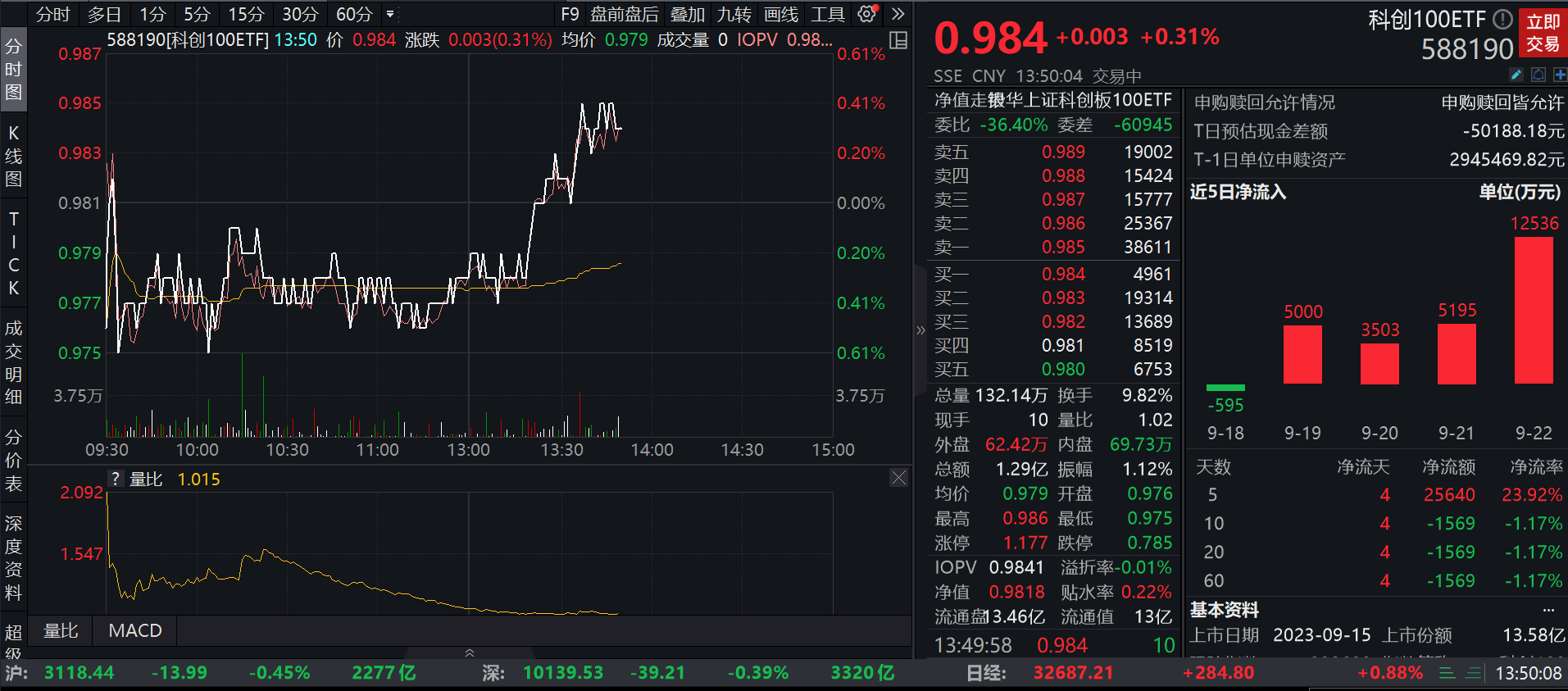 截至2023年9月25日13:50,科创100ETF(588190)午后拉升翻红,已涨0.31%,成交额达1.29亿元,换手率达9.82%,市场交投活跃。数据显示,该基金已连续4个交易日获资金净流入。