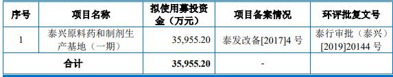 据公司招股书,公司拟募集资金35,955.20万元,全部用于泰兴原料药和制剂生产基地(一期)项目。