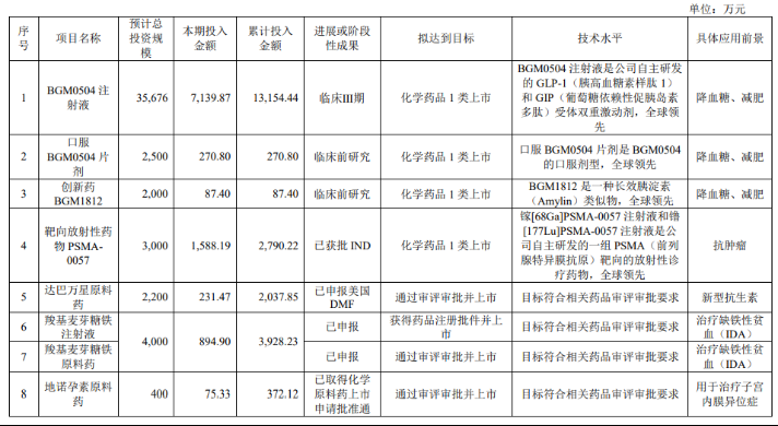 截至2024年末,BGM0504注射液进入临床Ⅲ期,已投入约1.32亿元,未来尚需两个多亿的重金投入。