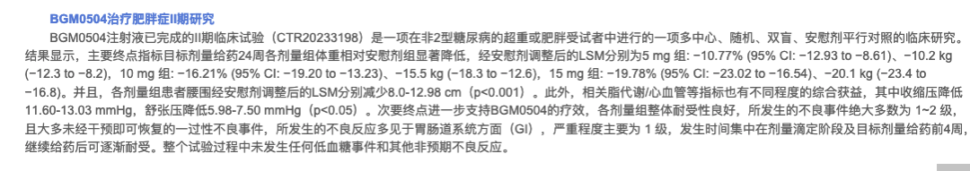 截止该公司2025年一季报披露日,博瑞新药布局:BGM0504注射液(GLP-1和GIP双重受体激动剂)在国内同步进行减重与2型糖尿病双适应症III期临床试验;BGM0504注射液减重适应症在美国已获批IND,在美国开展的 US bridging 临床研究已基本完成、正在进行临床总结报告;口服BGM0504片剂、创新药BGM1812(一种长效胰淀素(Amylin)类似物)处于临床前研究阶段。