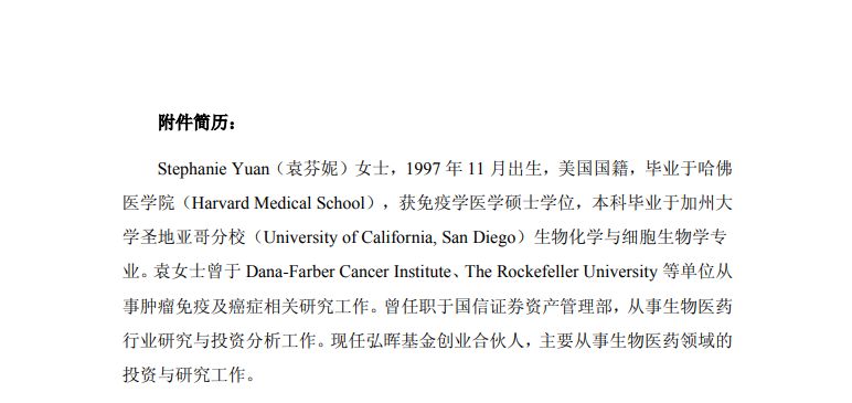 据公告,袁芬妮女士,1997年11月出生,美国国籍,毕业于哈佛医学院,获免疫学医学硕士学位,本科毕业于加州大学圣地亚哥分校生物化学与细胞生物学专业。袁女士曾于Dana-Farber Cancer Institute、The Rockefeller University等单位从事肿瘤免疫及癌症相关研究工作。曾任职于国信证券资产管理部,从事生物医药行业研究与投资分析工作。现任弘晖基金创业合伙人,主要从事生物医药领域的投资与研究工作。