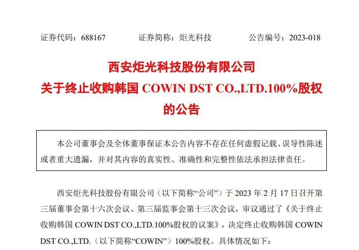 据悉,2022年9月,炬光科技拟3.5亿元收购韩国面板/半导体设备厂商COWIN DST CO.LTD.(以下简称“COWIN”)100%股权,因韩方交易审批迟迟未见结果,于2023年2月17日召开董事会审议终止收购该标的公司。