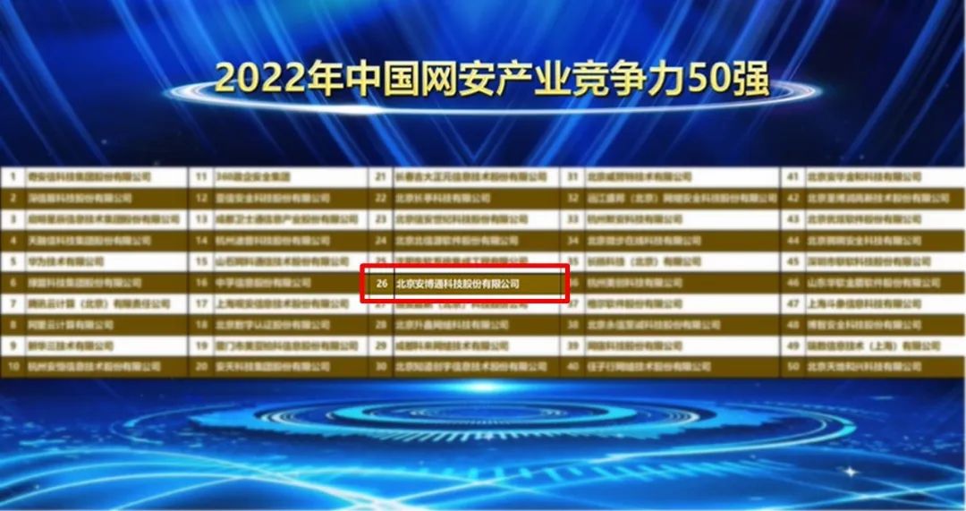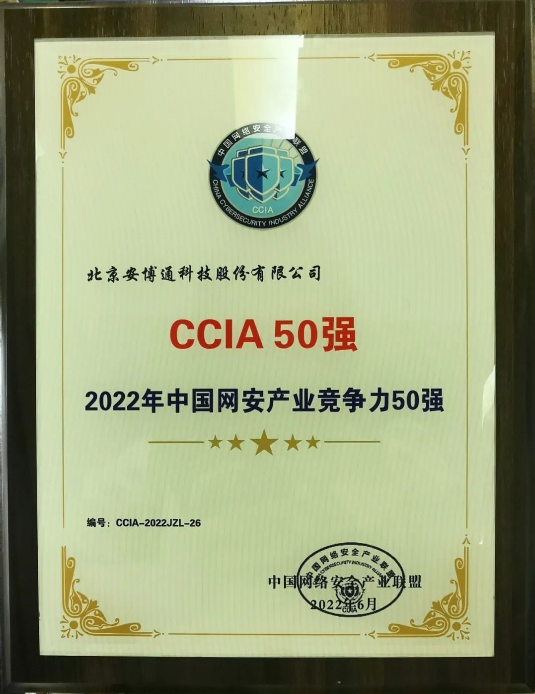 2022年6月,中国网络安全产业联盟(CCIA)发布“2022年CCIA中国网络安全竞争力50强”(以下简称“CCIA 50强”),安博通三度入选,综合排名较去年上升3位。