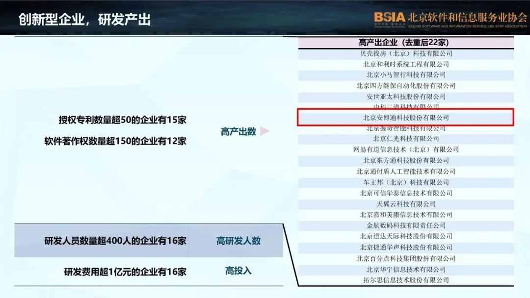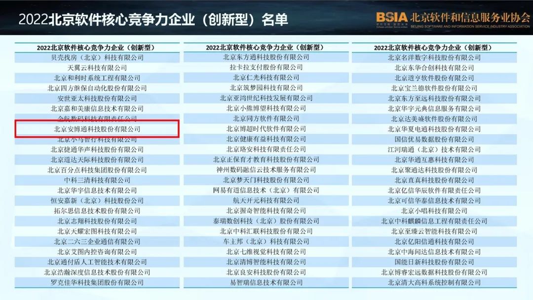 2022年12月28日,北京软件和信息服务业协会正式发布《2022北京软件企业核心竞争力评价报告》,安博通再次入选“北京软件核心竞争力企业(创新型)”。