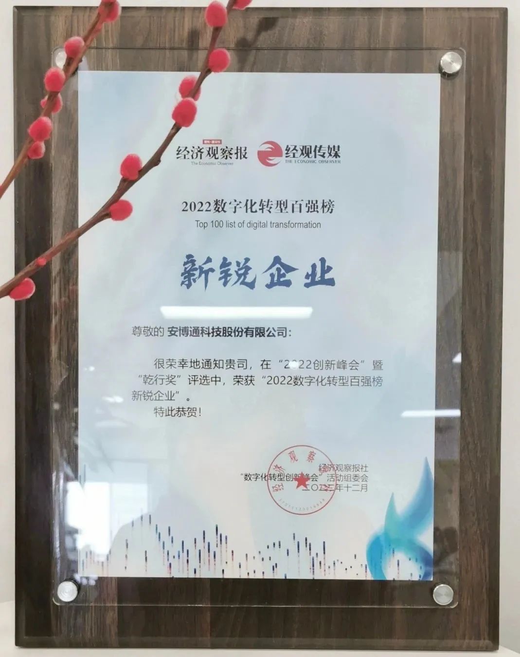 2022年数字经济奔涌发展,技术变革迎来了新的希望之火。峰会现场发布了“2022年度数字化转型百强榜”,安博通凭借“元溯”数据安全新品入选数字化转型新锐企业。