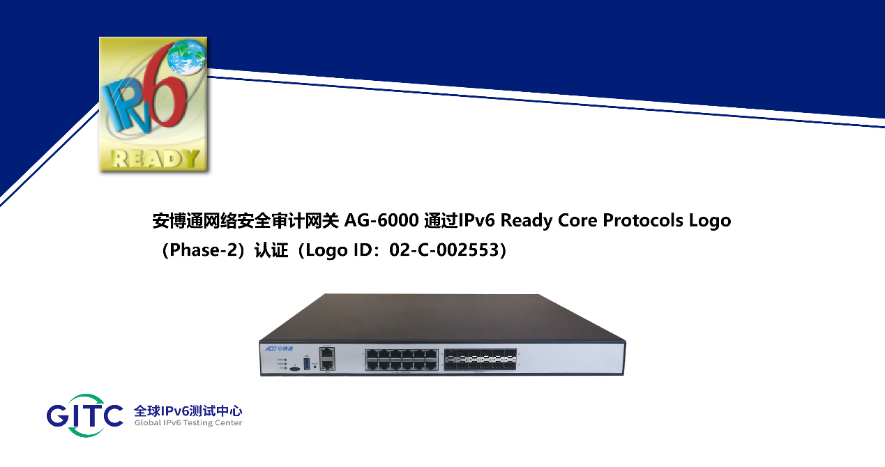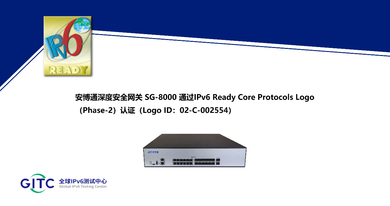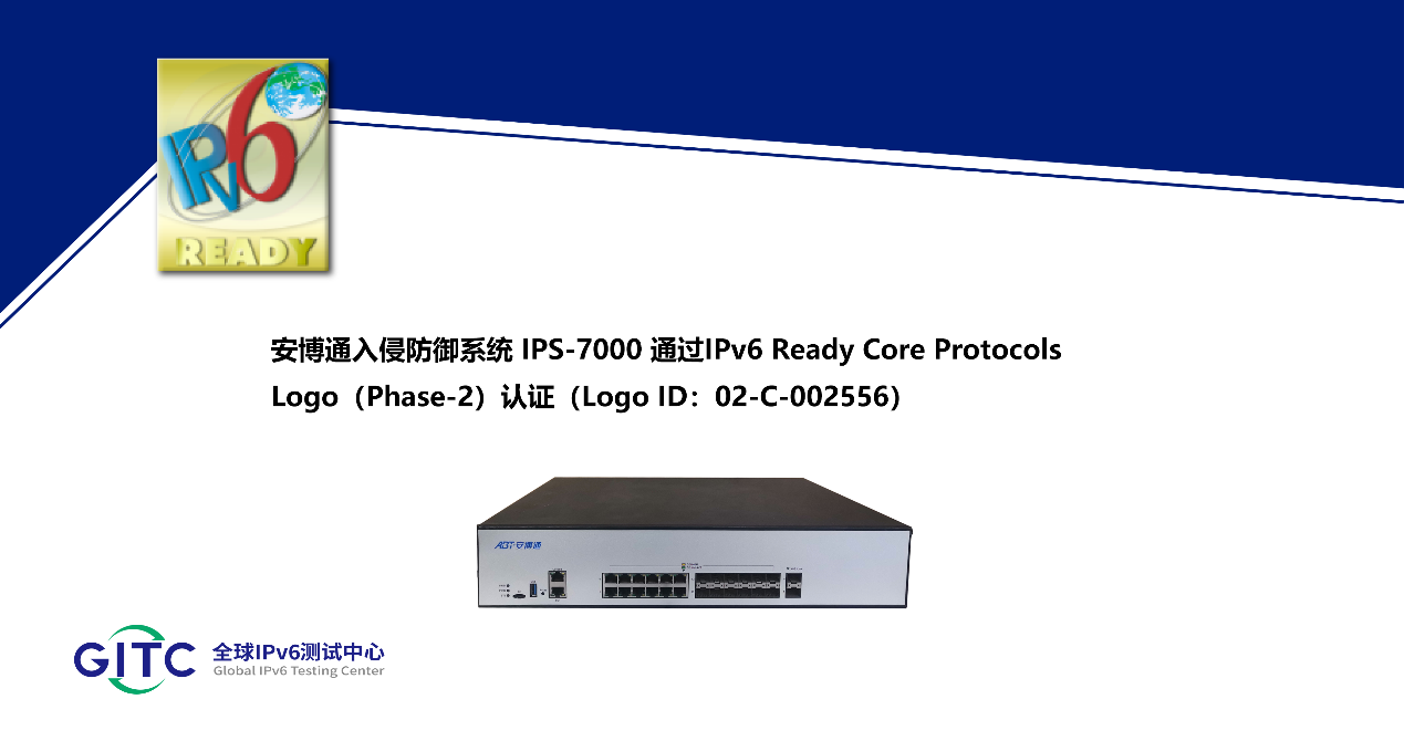 近日,北京安博通科技股份有限公司旗下网络安全审计网关 AG-6000、入侵防御系统 IPS-7000、深度安全网关 SG-8000在下一代互联网国家工程中心-全球IPv6测试中心正式通过IPv6 Ready核心协议Phase-2测试,并荣获由国际组织IPv6 Forum颁发的IPv6 Ready Logo Phase-2认证证书(Logo ID:02-C-002553、02-C-002554、02-C-002556)。这标志着上述产品的IPv6核心协议实现已全面符合IETF RFC相关标准,其一致性和互通性得到了权威验证。