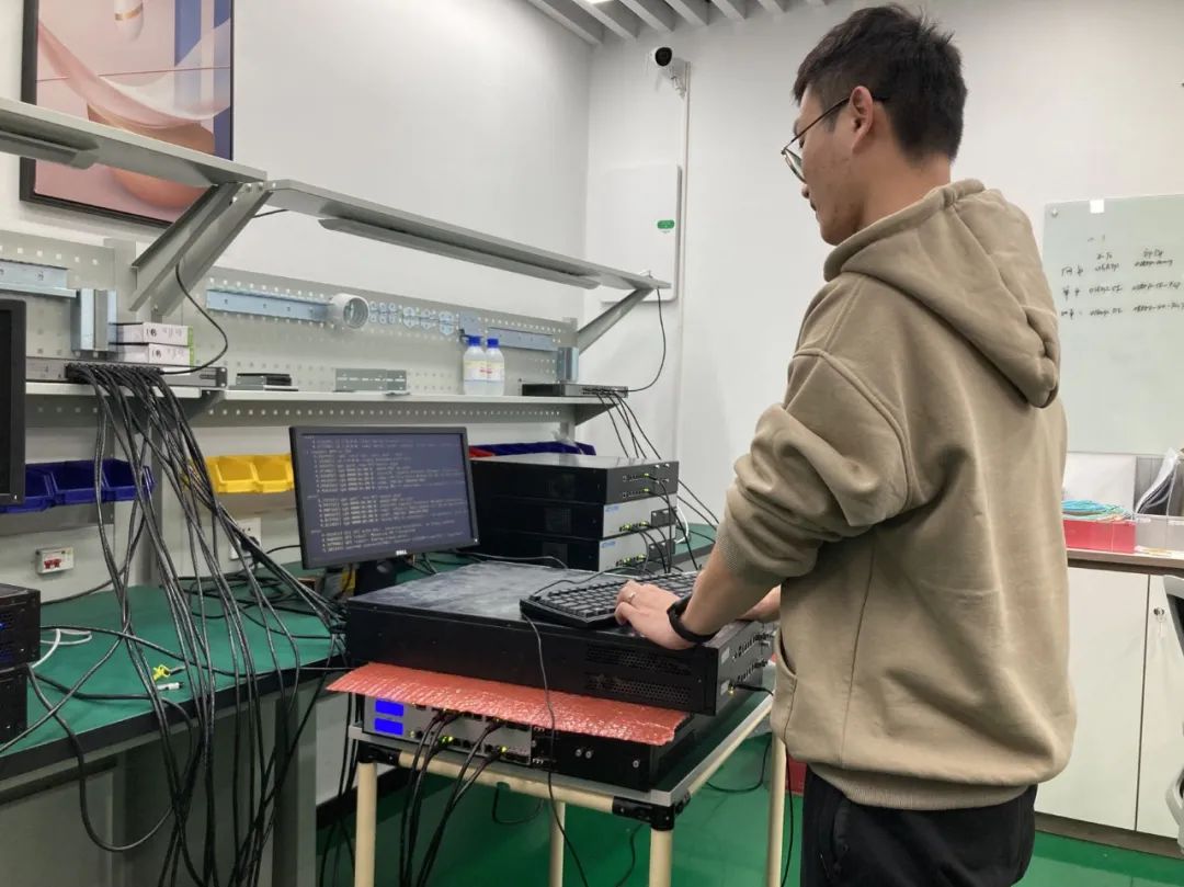 机房中,工作人员正在调试设备