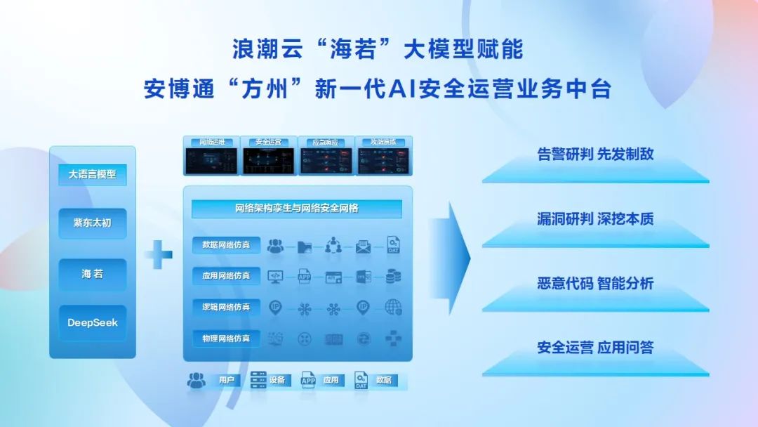 随着全球对AI大模型的关注热潮,AI安全防护也成为了技术焦点。安博通与浪潮云联合推出“方州”新一代AI安全运营业务中台,由“海若”大模型赋能安全运营,实现对海量安全数据的快速分析处理,能够更准确地识别潜在的安全威胁。同时,进一步提升安全事件的响应速度和处理效率,在面对复杂安全挑战时能够更迅速地作出反应。