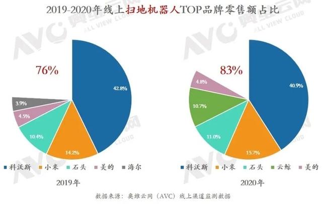 线上渠道是扫地机器人最主要的销售渠道,2020年中国扫地机器人销售额达79亿元,其中线上销售额占比高达97.47%。据奥维数据,2020年线上渠道各品牌市占率,科沃斯40.9%,小米15.7%、石头科技11.0%、云鲸10.7%,美的4.8%,这五个主要品牌总共占领了市场83.1%的份额,竞争相当激烈,其它则是多家份额更小的品牌。