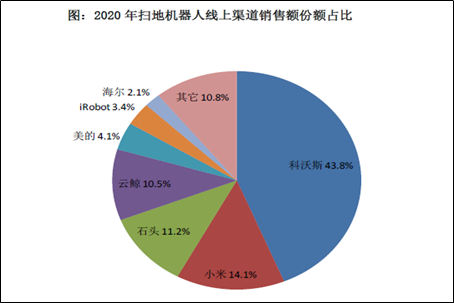 《2021年扫地机器人市场发展白皮书》显示,线上市场科沃斯以43.8%的市场销售额份额稳居行业第一,第二、三名分别为小米和石头斩获,销售额占比分别为14.1%和11.2%。线下市场,科沃斯销售额占比78.2%,一家独大。