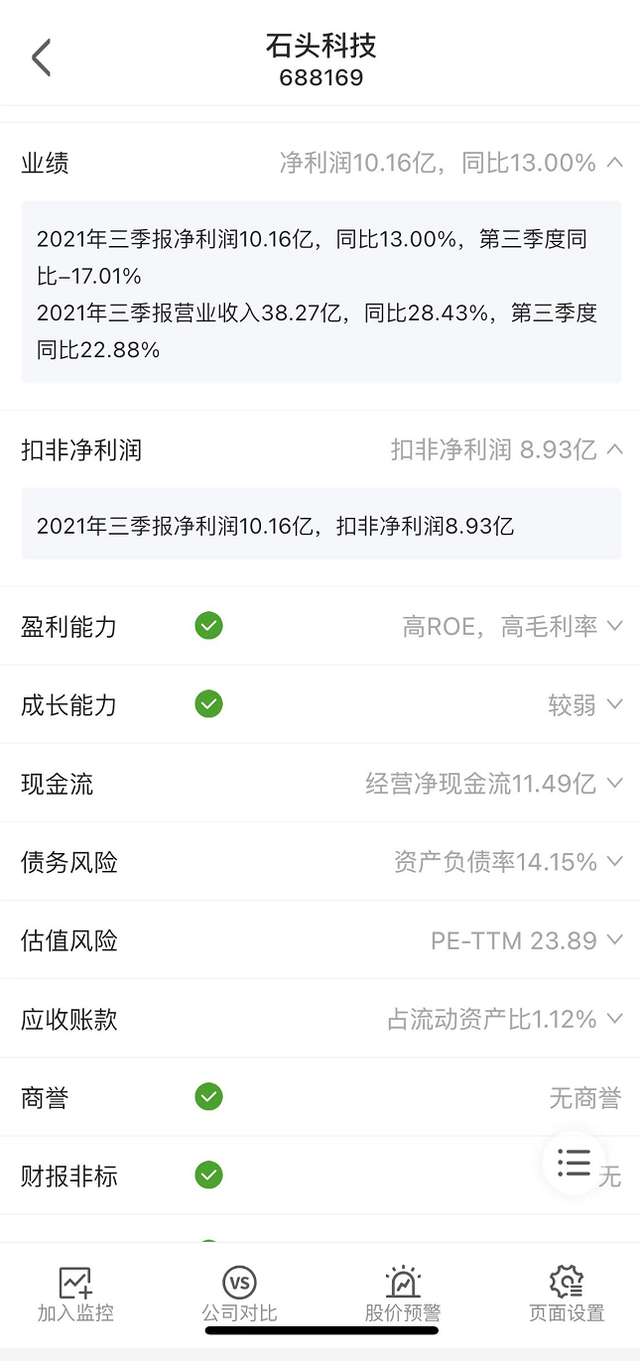 据摸象APP数据显示,石头科技2021年三季度报营业收入38.27亿,同比增长28.43%;净利润10.16亿,同比增长13%;扣非净利润8.93亿。
