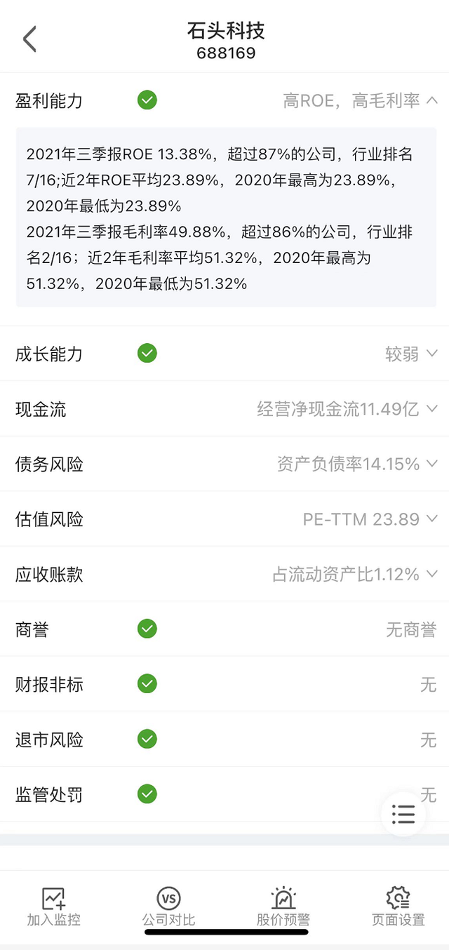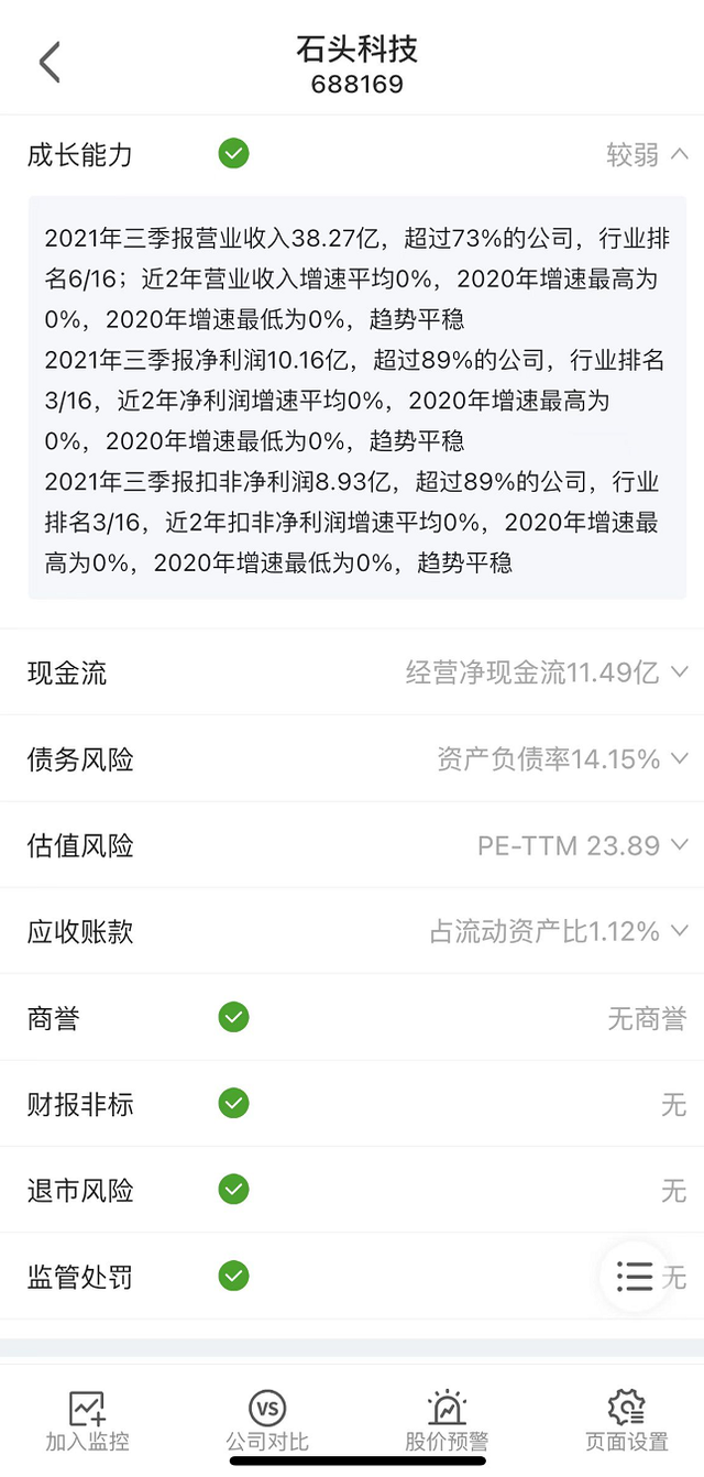 成长能力方面,石头科技近两年的营业收入、净利润集扣非净利润增速平均值都为0%。
