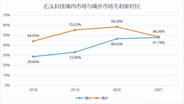 过去几年,石头科技境外市场一直在高速增长,而且海外市场毛利率始终都高于国内市场。2019年,境外市场毛利率55.23%,境内市场毛利率33.06%,相差22个百分点。2020年,境外市场毛利率更是达到了58%。