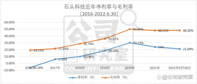 财报显示,2016年至2021年,石头科技的毛利率分别为19.21%、21.64%、28.79%、36.12%、49.99%、48.11%。与此同时,公司的净利率也同步上升,2018—2022.06.30,分别为10.08%、18.62%、30.23%、24.03%、21.09%,始终保持在两位数,特别是近3年始终在20%以上,远超业内同行。
