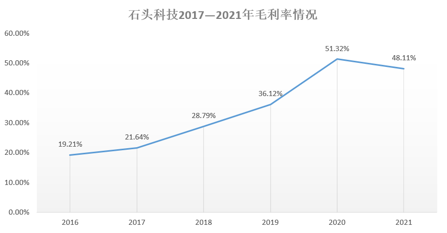 2016年,石头科技的毛利率不到20%,到了2020年涨到51.32%,但到去年时下降3.21个百分点至48.11%。整体来讲,该项指标处在上升的态势。