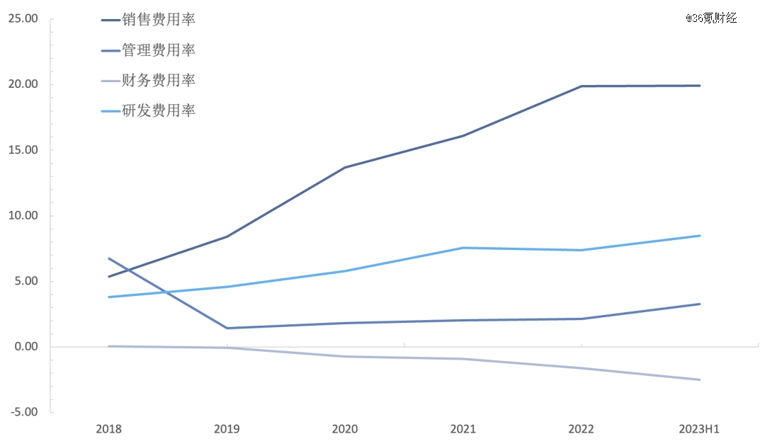 作为典型包含科技概念的消费型企业,石头在费用端的核心看点自然是销售费用和研发费用两大科目。近5年来,销售费用整体上有较大幅度的攀升,22年的销售费用支出是18年的8倍,近两年的销售费用率也逼近20%。