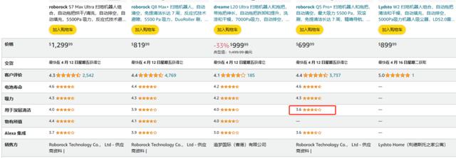 但石头科技部分产品表现却欠佳,这或将影响石头科技在海外销量。如亚马逊平台售价699美元的石头Q5Pro+,3737名消费者针对该系列产品在深度清洁方面的表现只给出3.6分。