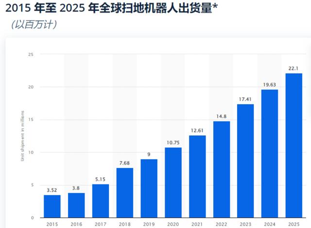 Statista数据显示,2024年到2025年全球扫地机器人出货量分别为19.63百万台和22.1百万台,行业增速有所放缓。