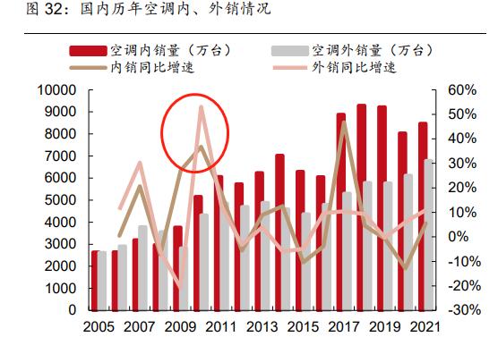 如2009年以前业内普遍为定频空调,主要满足用户对调节室内温度的需求。2009年变频空调的出现,满足高效节能的社会效益和经济效益需求。相较于定频空调而言,变频空调制冷更快、更省电耐用。随着变频技术的应用和普及,国内空调行业在内销和外销上均创下销售新高。