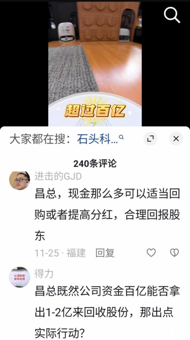 或也因此,近期昌敬多次在视频平台强调,“现在是石头科技基本面比较好的时候,有现在的基本面,到最后的产生结果,我觉得也不会有特别长的时间了,也请大家耐心等待一下。”昌敬还强调公司“粮草充足,现金储备超过百亿”。