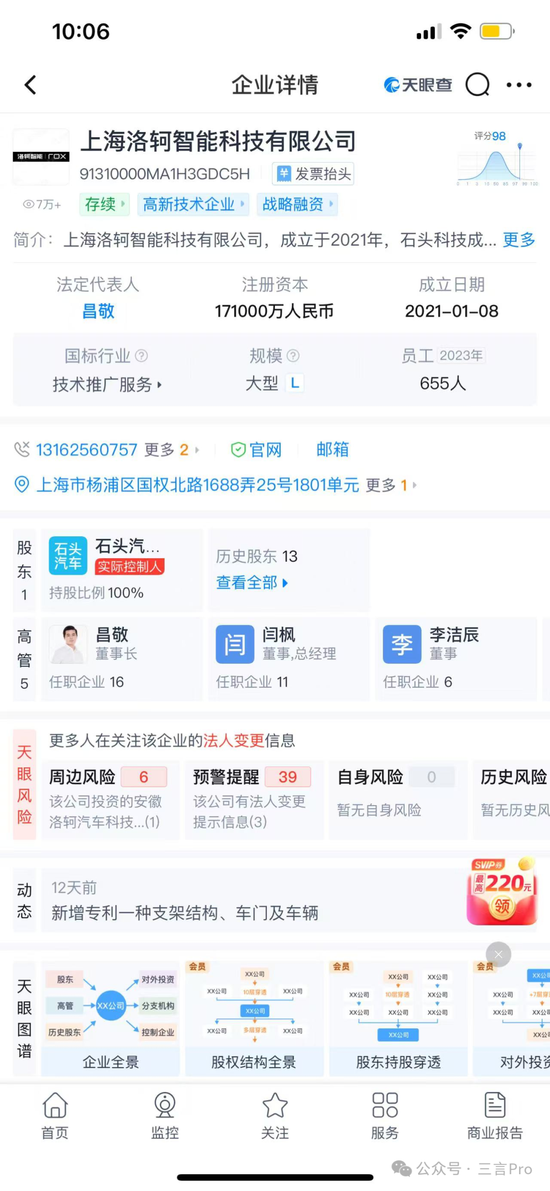 天眼查显示,极石汽车关联公司上海洛轲智能科技有限公司注册资本17.1亿元,法定代表人为昌敬,由石头汽车(香港)有限公司全资持股。