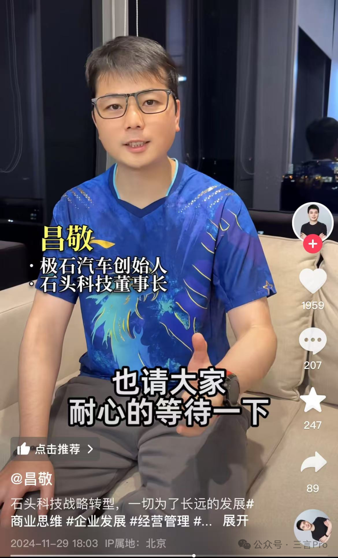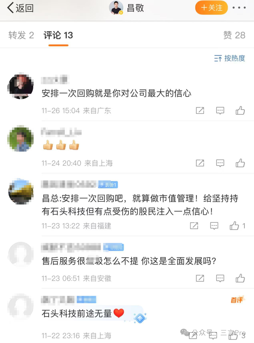 11月29日,昌敬再次发布视频表示,铺天盖地的评论为其带来了一定的困扰。他希望持有石头科技股票的投资者可以耐心一点,公司的战略不可能一成不变,现在是一个战略的转型期,特别是一个阵痛期,势必会带来公司的一些变化,这些变化都是为了以后更长远的发展。假如为了稳定股价让公司不发展了,过段时间公司也会走下坡路,还是希望公司能够长期发展。