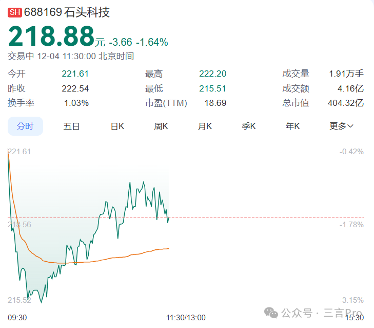 截至发稿,石头科技的股票今日跌1.76%,报218.88元/股,总市值404.32亿元。