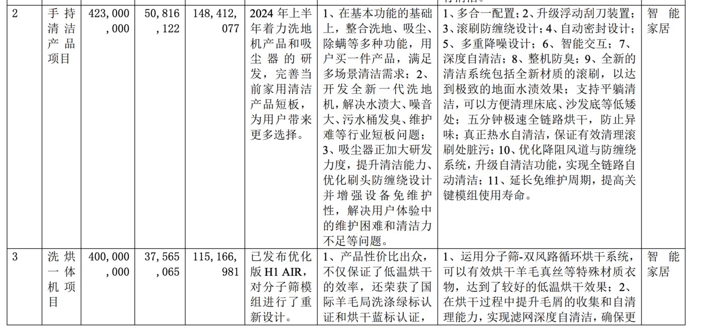 进入2024年,石头科技不仅更新了洗烘一体机产品线,同时还入局近两年刚刚兴起的迷你洗衣机赛道,同时开辟多个品类甚至需要跨赛道布局,对于石头科技的压力可想而知。其在半年报中曾披露,“洗烘一体机项目”预计总投资规模为4亿元,报告发布时已经投入1.15亿元。