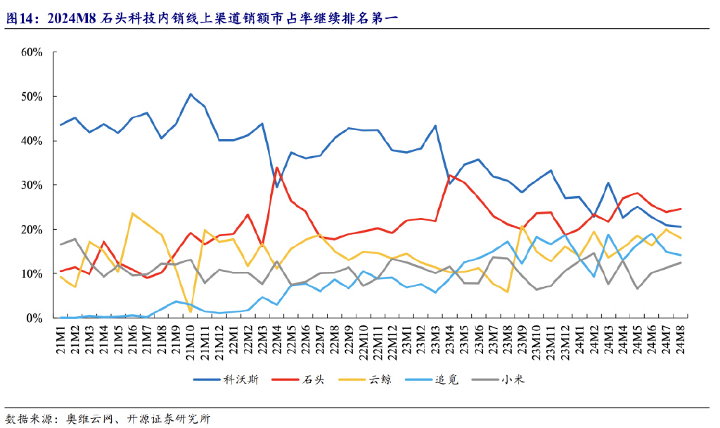 但科沃斯这些年的海外表现并不太好,整个2024年在海外的增速也就与大盘基本持平,所以市占率几乎没有什么变化,而且产品可能还是过于分散,注意力不够集中,在扫地机、洗地机外又搞了擦窗机、割草机、料理机、卷发棒等,虽然营收有所增加,但利润下降却很明显。追觅减少费用投放后近期的增速有放缓趋势,像云鲸这种产品线较为单一的就更不用说了,国内外都打不赢。所以,整个一圈看下来,最能打的还是石头。