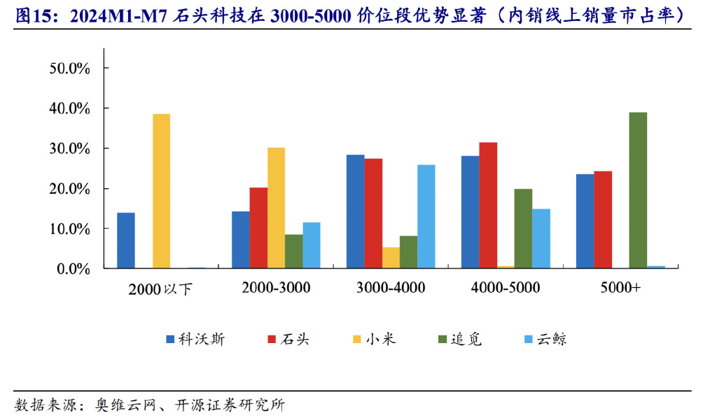 我们看下图,在3-5k这个最主流的扫地机器人价格带,石头科技的优势是最为明显的,这也是行业内高端市场的价格带区间,充分说明石头科技的品牌力足够强,所以它的高价格产品才如此受市场的认可。
