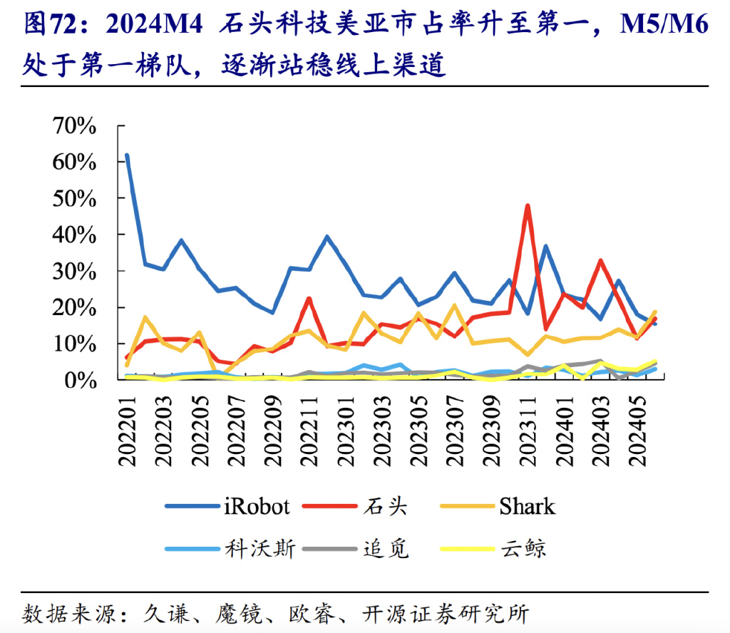 石头现在的业绩增速更多取决于海外表现,这里也更多讲一下海外的情况。目前,在美国亚马逊,石头科技的市占率已经提升至第一,虽偶尔有反复,但总归是第一梯队。