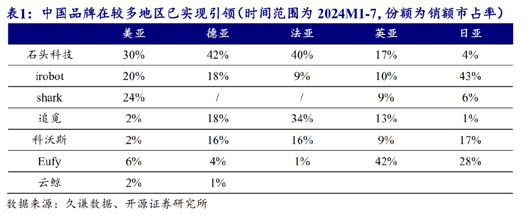 不过和国内不太一样,美国清洁电器的销售更多是通过线下渠道,而在线下渠道, iRobot仍占据领导地位。根据近期石头科技的投资者交流,北美市场上半年以线上销售为主,毛利率可做到60%左右,净利润率约26%-28%,不过下半年会加大线下渠道拓展,随着线下渠道的扩展,毛利率仍能保持在55%左右,但净利率可能会有所下滑。根据公司 2024 年半年报,目前在 Target/Bestbuy 入驻门店数分别达 1400/700 家,后续线下渠道的入驻速度应当会进一步加快,那么北美的增速大概率也会进一步加快。