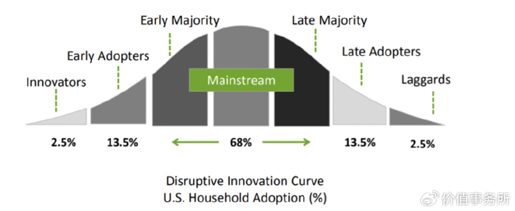 其实仔细一推算也应当是如此,一款因为技术进步创造出的全新需求产品在大众中普及,大约会分为如下几个阶段:先是占总人群约2.5%的技术狂热者接触这项产品;紧接着,随着技术进步、产品更加好用,会吸引到占总人群约13.5%的早期用户;而后,随着技术越来越进步、产品越来越好用,产品在用户中的渗透率会逐渐增加,规模效应又会使得相应产品成本下降,从而价格下降,致使产品渗透率进一步增长,最终完成所有用户的普及。