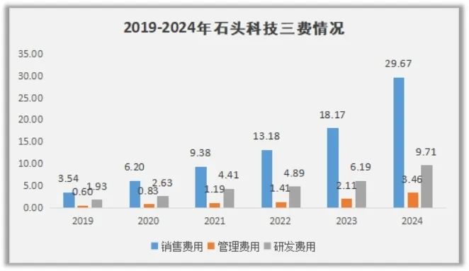 费用飙升:2024年,销售费用同比增长63.29%,管理费用同比增长63.98%,研发费用同比增长56.93%。广告及市场推广费用达到19.24亿元,较2023年增长77.49%,增加额达8.4 亿元。如此大规模的费用增长,远超营收增速,净利润自然难以维持。